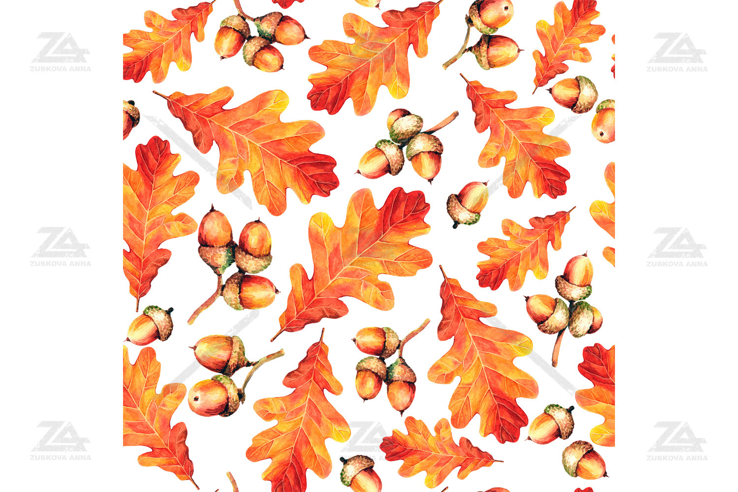 6 Seamless patterns with colorful watercolor Autumn Oak acorns and leaves. Hand drawn watercolor wallpapers with Fall Leaves and Acorns. Golden silhouettes of Oak Leaf and Acorn.